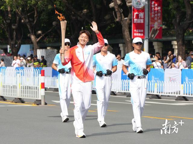 十五运会火炬传递广州站现场,第九棒火炬手中国国家男子篮球队队长赵睿边跑边与路边市民挥手致意。