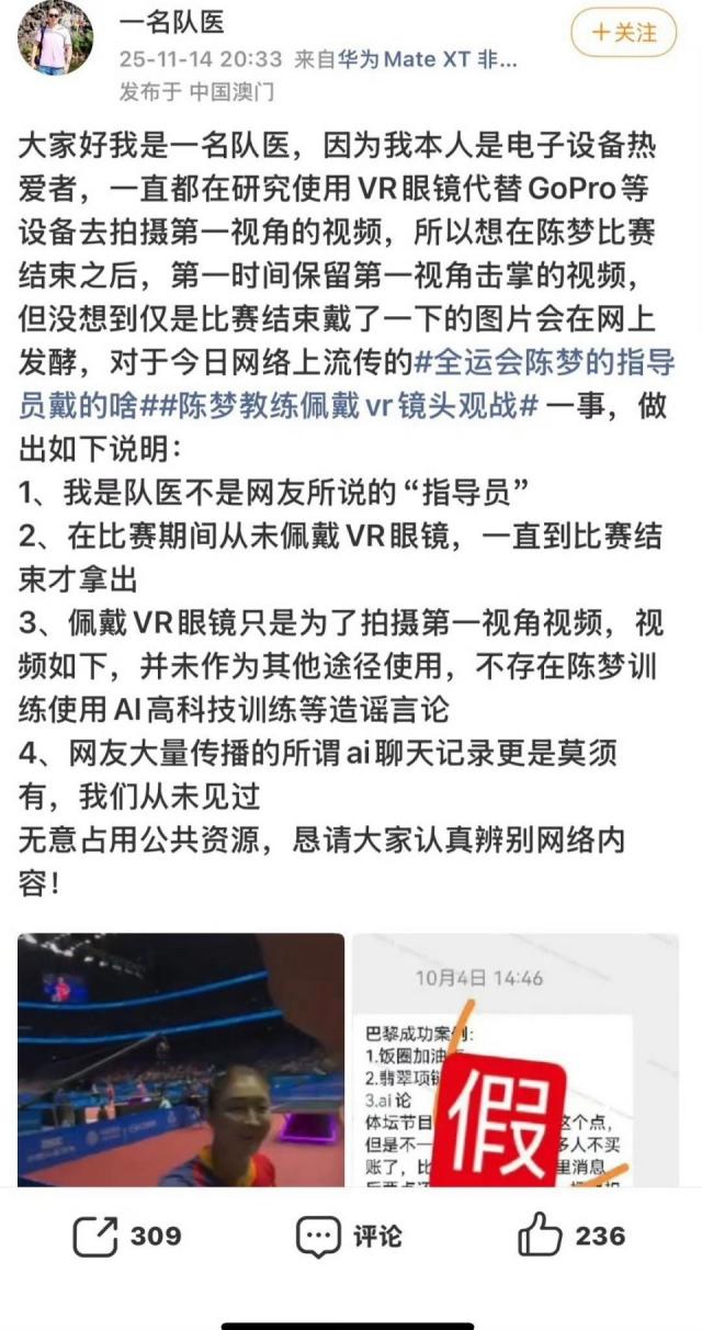 对此,所谓的"陈梦指导员"公开做出回应,他写道:"大家好,我是一名队医,因为我本人是电子设备热爱者,一直都在研究使用 VR 眼镜代替 GoPro 等设备去拍摄第一视角的视频,所以想在陈梦比赛结束之后,第一时间保留第一视角击掌的视频,但没想到仅是比赛结束戴了一下的图片会在网上发酵。对于今日网络上流传的事件,做出如下说明: