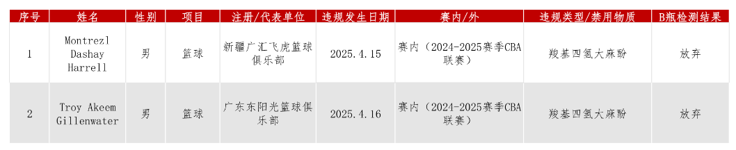 此前,中国反兴奋剂中心公示:新疆队外援哈雷尔和广东队吉伦沃特股票推手,被确认在今年4月中旬的药检中违规。