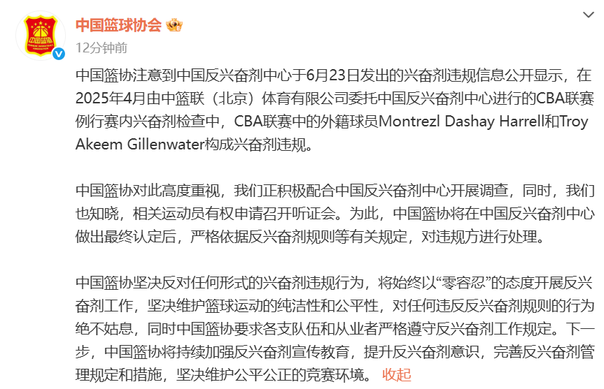 中国篮协注意到中国反兴奋剂中心于6月23日发出的兴奋剂违规信息公开显示,在2025年4月由中篮联(北京)体育有限公司委托中国反兴奋剂中心进行的CBA联赛例行赛内兴奋剂检查中股票推手,CBA联赛中的外籍球员Montrezl Dashay Harrell和Troy Akeem Gillenwater构成兴奋剂违规。